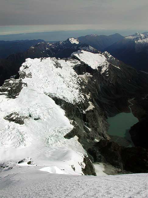 Looking to the north from near the summit. The peaks are Stargazer and Moonraker. Rumor has it that the opening scenes from "The Two Towers" the second of the Lord of the Rings movie Trilogy, were shot flying along this ridge. These remote peaks of the Haast Range are very seldom visited. |