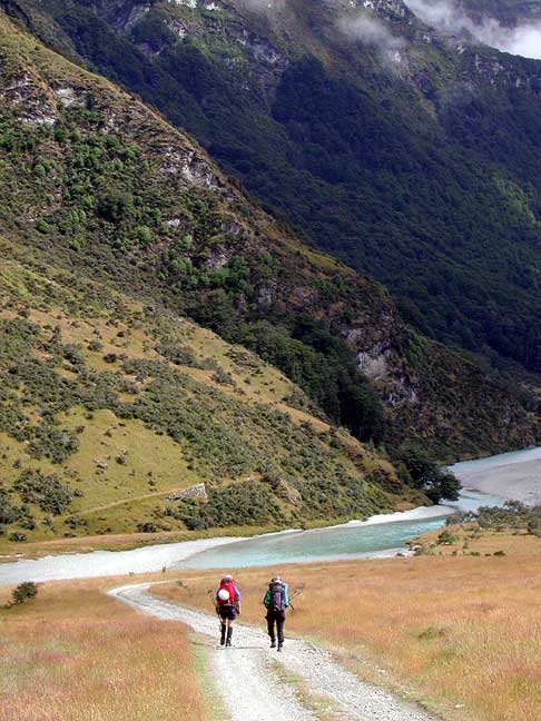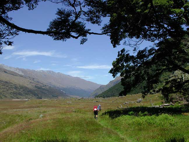 Moving right along, we flew out the following noon, catching a "back-flight" from another group coming in, and drove over the Queenstown. Over dinner in an East Indian restaurant we planned our next assault, that of Mount Earnslaw. Here we are hiking up the Rees Valley en route to the peak. |