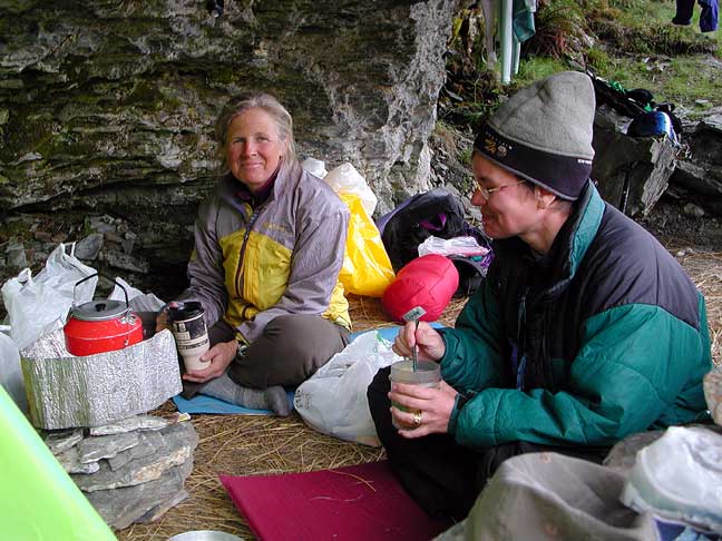 Susan and Kathy on summit day. Here, we are above most of the difficulties, putting on a few more bits of clothing to counter the very high winds. |