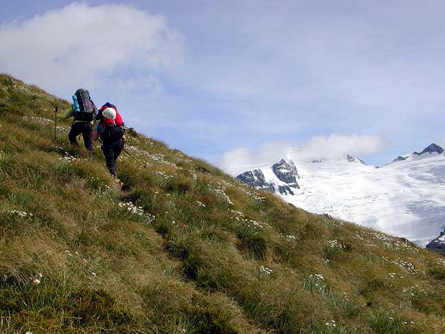 On our second day of the Mount Earnslaw climb, we hike up pleasant meadows to above the grass line. Mount Head, the highest peak of the Forbes Mountains lies behind. |