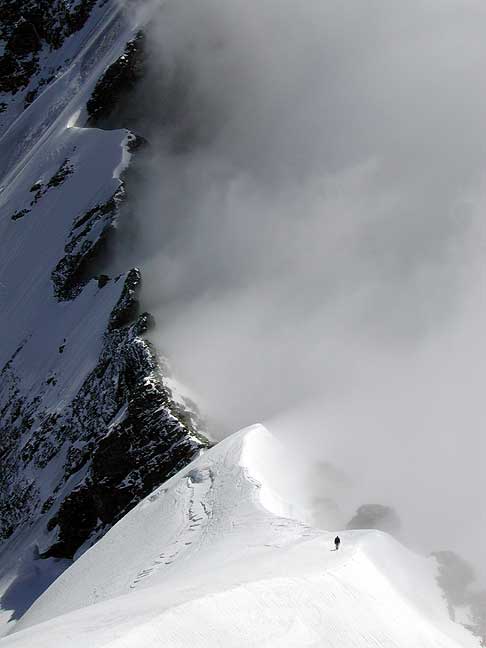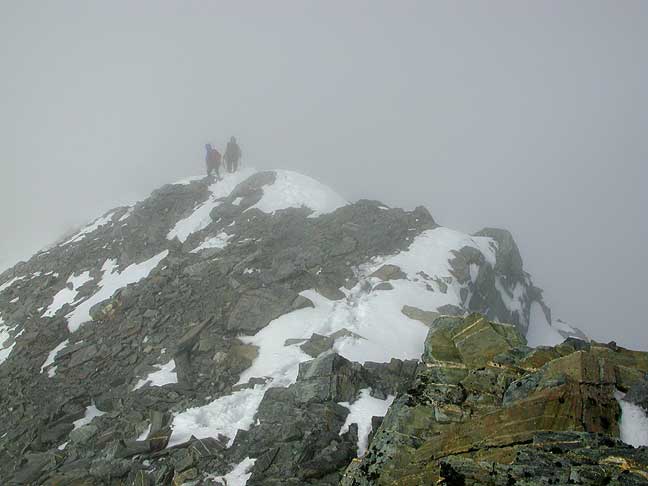 Descending back into the mists, off the summit. |