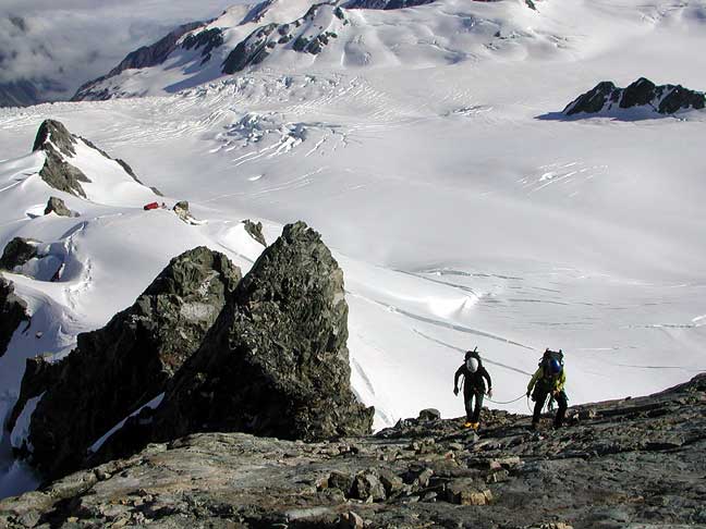 Laurie and Kathy on the West Ridge of Aurora, their first climbthe immense Franz Josef Glacier spread out below. |