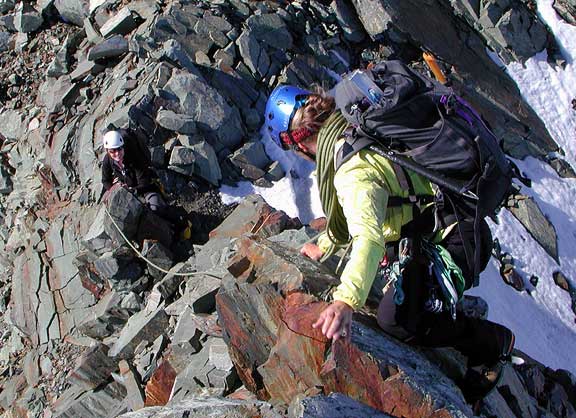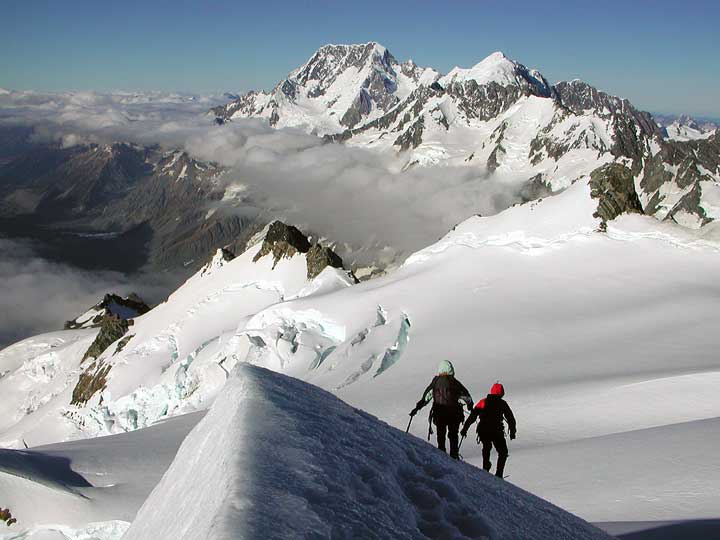 Kathy and Laurie on the NW Ridge of Jervois, their second climb. This is a fun climb over hill and dale. The hut is conveniently close at hand, visible in this photo as the red blob on the left. |