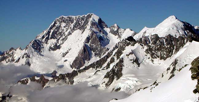 After the Minarets, Laurie and Kathy then caught a fantastic helicopter ride to the Plateau Hut from which they climbed Cook. In this view of Cook and Tasman from the NE, the hut would be out of sight to the left. The ridge coming toward the camera on Cook is the Zurbriggen Ridge, the ridge on which the Linda Glacier route finishes. The Linda Glacier lies to the right of the summit and curves back under it from right to left. |