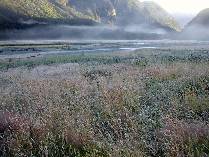 As we climb a bit higher we come to the Routeburn Flats, a large meadow, just catching the early morning light. |