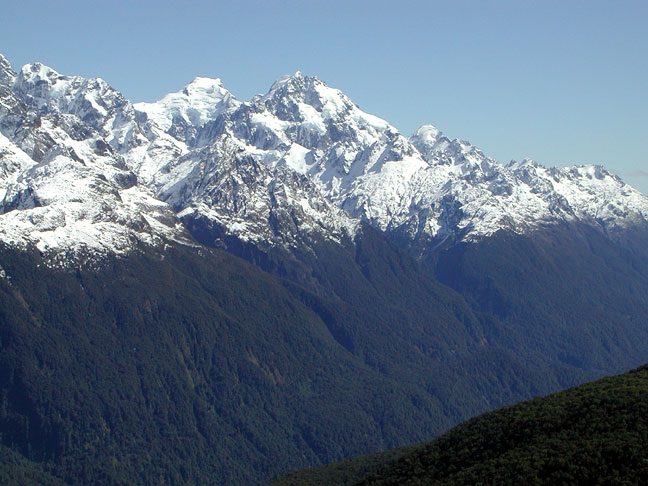 The view accross the Hollyford Valley. Mount Tutoko, the highest peak in the Darrans, behind. |
