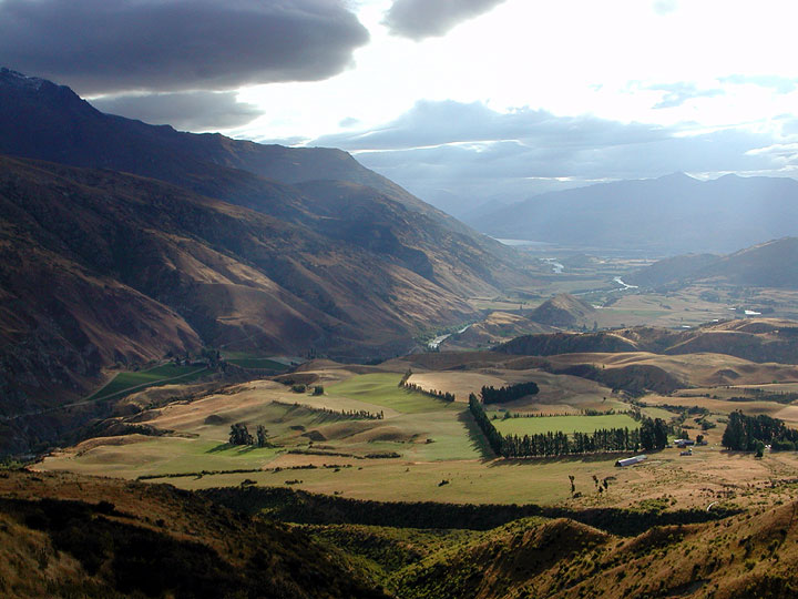 Driving back over the Crown Range on the way to Wanaka. Here we are looking west back towards Queenstown, which is at the back of the photo on the edge of the lake. The Remarkables rise to the left. |