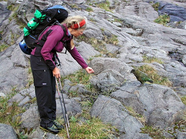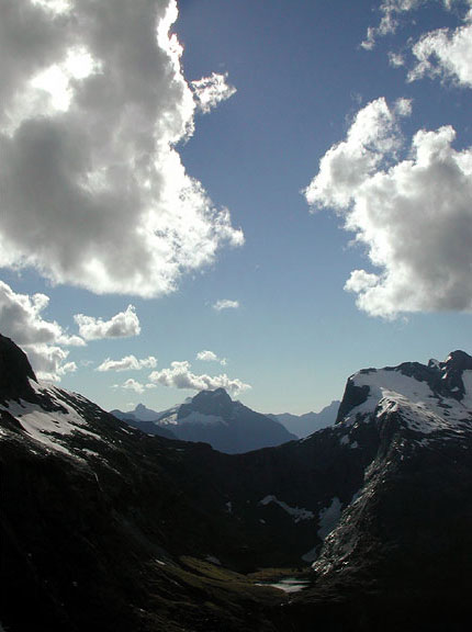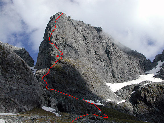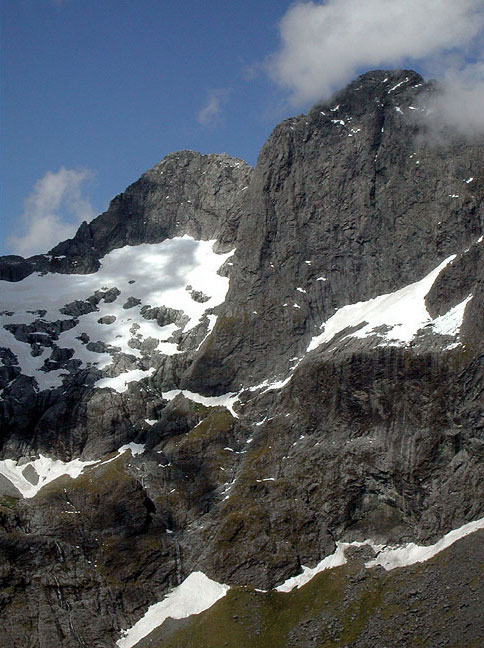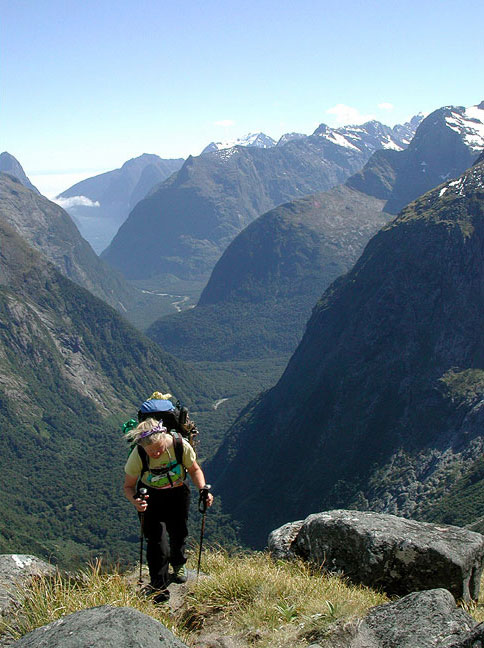 We walked in over Gertrude Saddle, starting from the Homer Hut. This is a great way to get into the peak—quick, scenic, and with the traverse around Barrier Knob and the descent of Gifford's Crack, even rather interesting. Here, Kathy hikes up towards Barrier Knob. The Milford sound is behind. |