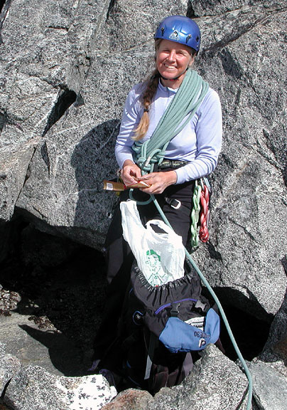 | Breaking out lunch, high on the climb near the top of the Buttress. |