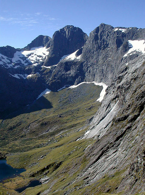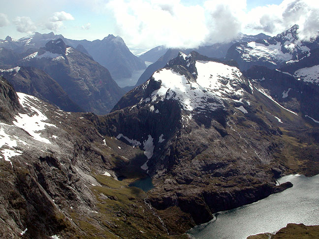 | The view from near the summit. Lake Adelaide on the right, Lake South America, Adelaide Saddle and The Sentinel near center, and Milford Sound behind. |
