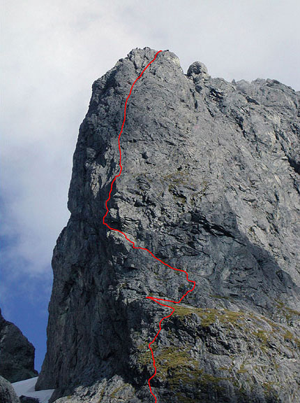 The upper part of the approach and the climb, taken on our descent. The route down goes left, into the notch—lots of downclimbing and about 6 or 7 rappels. While long rappels make things a bit easier, with a bit more downclimbing, a single 50 meter rope will suffice (25 meter rappels). |