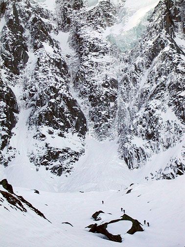 The route up to the Grands Mulets hut, the normal ski route on Mont Blanc, starts out close under the north face of the Aiguille du Midi. |