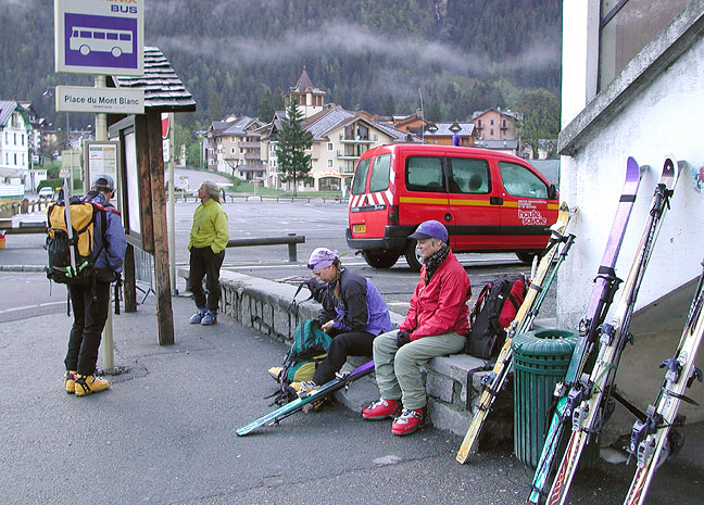 Not to be discouraged, and after a day of relaxation, we departed on a one day tour over the Cols Crochues and Berard and down to the little hamlet of le Buet. Here we are waiting for the bus in Chamonix. |