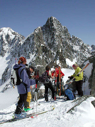 Stripping the skins at the Col. The Aiguille Crochues behind. |