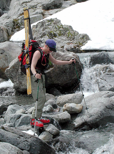 | Eventually we run out of snow. Lanice negotiates a stream crossing. |