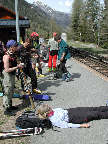 | Kathy had a few too many beers! Waiting for the train to take us back to Chamonix. |