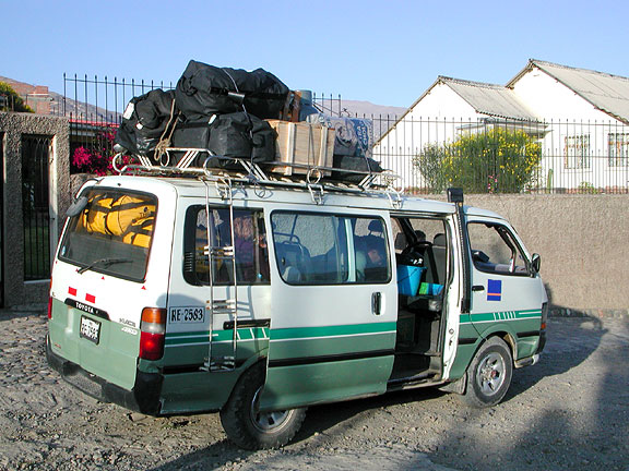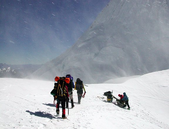 Heidi and Kathy came up to high camp the day after Mark, Emery and Derek climbed. Unfortunately, the weather got incredibly windy, putting an end to their summit plans. The entire team at high camp, just before we started down. Left to right are Peter Alvarado (an aspirant guide helping us out) Emery, Heidi, Derek and Kathy. |