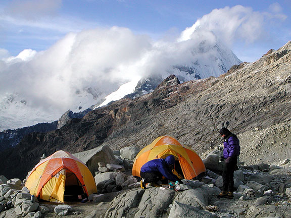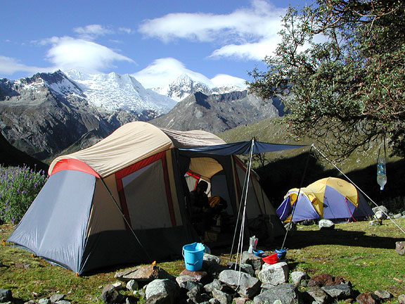 The trek into Alpamayo Base Camp take two days. On the night of the first, we camped at Ichicocha. Kathy heads to the kitchen for coffee! |