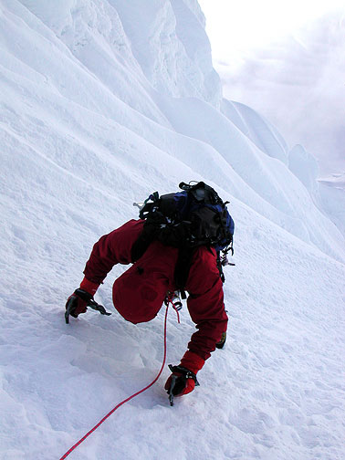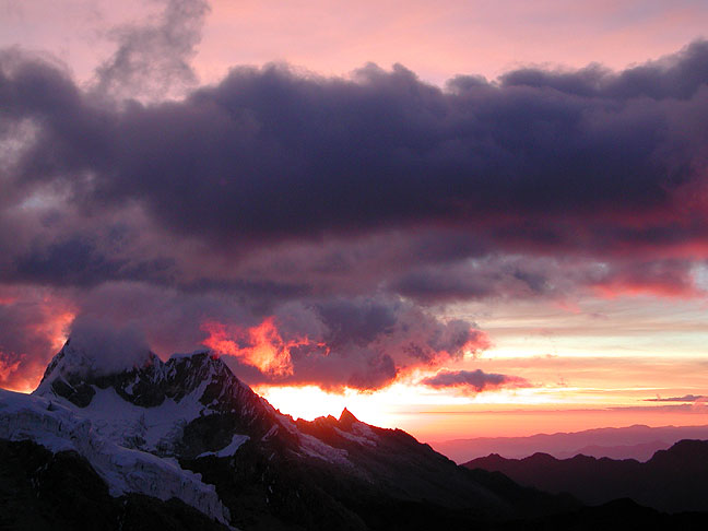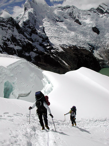| This year in Peru we had 3 great trips, one to Alpamayo and 2 in the Ishinca valley. On Alpamayo we were Joined by Heidi Wahl, Derek Porter and Emery Dameron. We had the usual mix of weather, but our summit day was fantastic. The route was rather different this year. A large cornice overhung the normal Ferrari route and we were forced into the gully to the left. A wild traverse left just below the cornice led to a gap and the summit ridge. From there the ridge could be followed (in some years this is not possible) all the way to the highest point. A couple short knife-edge sections on the crest added spice to the ascent. |