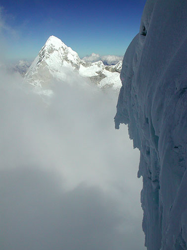 Alpamayo from Base Camp. The SW face, the usual side of ascent, is around to the left. |