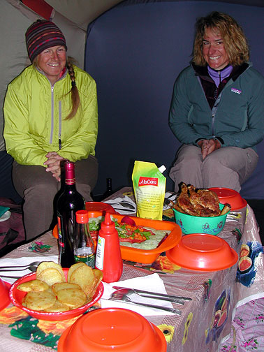 Kathy and Heidi about to dig into an incredible chicken base camp dinner. |