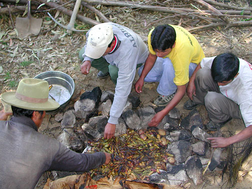 Unearthing the food. Under the layer of beans are the oca, potatoes, and well-wrapped and wonderfully seasoned packages of meat. |