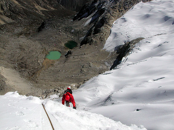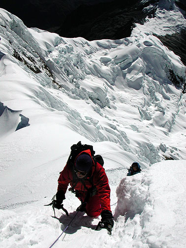 On the ice cliff. There were about 20 feet of 80° ice, lots of fun at 18000 feet! |