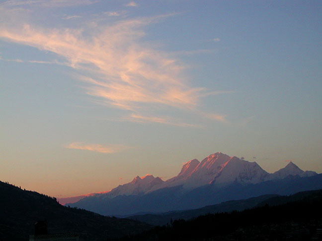 Sunset on Tocllaraju. The normal route climbs up around the left skyline and then to the summit. |