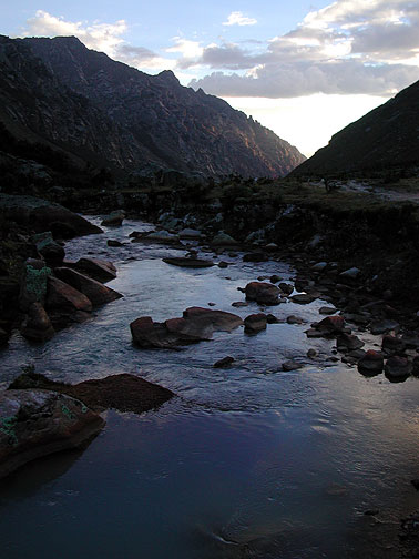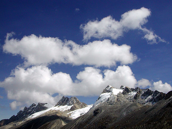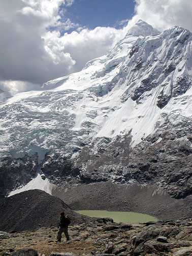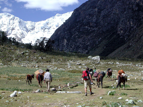 Trekking into the Isinca Valley. The high ridge between Tocllaraju and Palcaraju is in the background. |