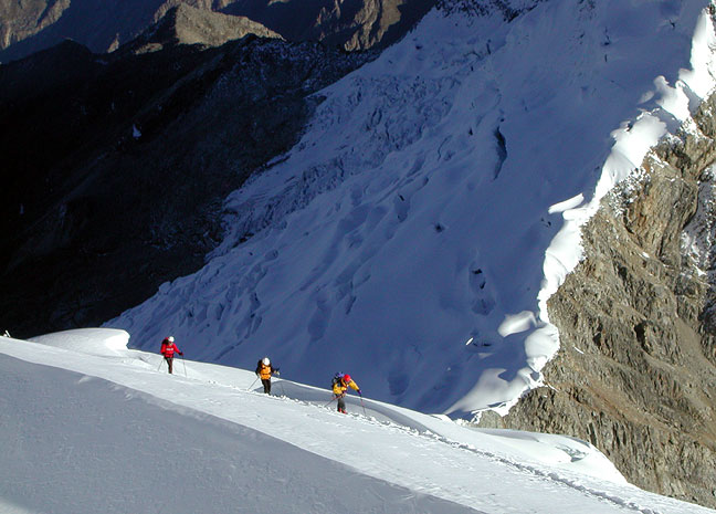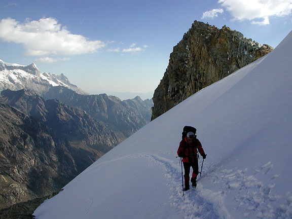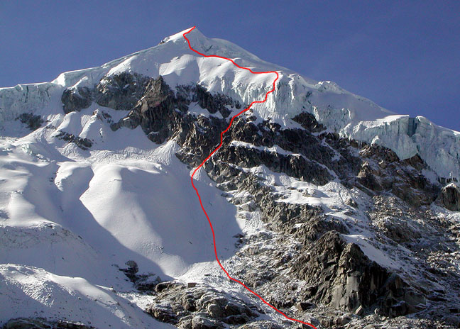 We wanted on more steep climb. The north side of Ishinca looked interesting, though we knew little about it. So we went exploring... The route looked feasible, though the ice cliff at the top was a big unknown. |