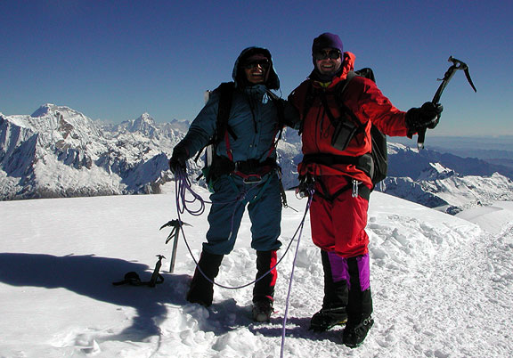Bill and Peter Alvarado on the last steep pitch of Tocllaraju. |