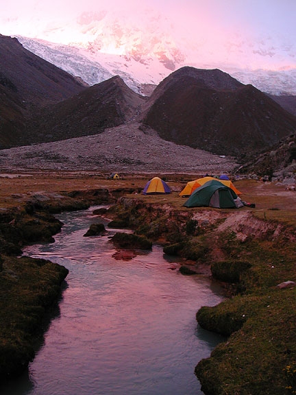 Nevados Urus. These peak rise directly above base camp. Urus Este is the rightmost of the three peaks and, believe it or not the lowest. On this trip we climbed the west summit, off to the left. |