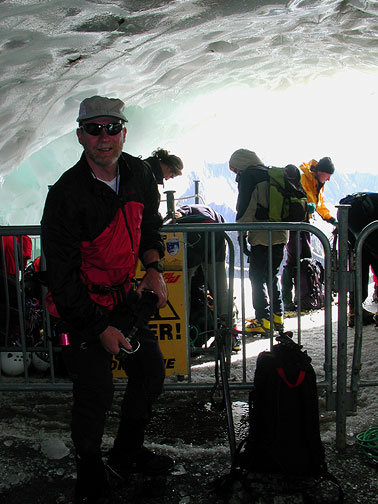 | Norm preparing to exit from the ice tunnel on the Aiguille du Midi. |