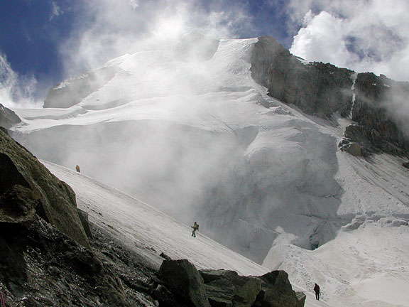 | Other climbers on the Points Lachenal. Here, we are looking up towards the ice cliffs of the Mont Blanc du Tacul. |
