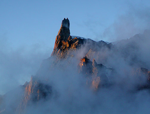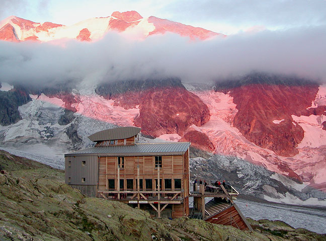 After the Dômes, they headed up to the Torino hut, on the border of France and Italy. Their first objective is the Dent du Géant, seen here in the setting sun, from the hut. |