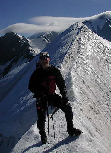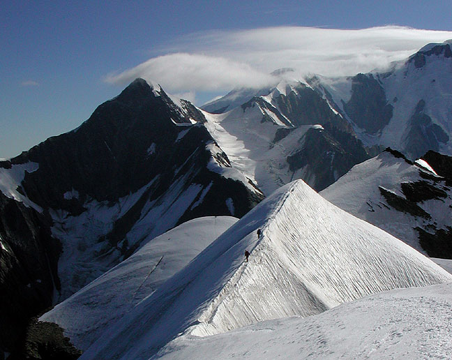 | The traverse of the Dômes de Miage is a classic ridge traverse, sometimes on rock and at others on fine snow aretes such as this one behind Norm. High winds on Mont Blanc behind. |