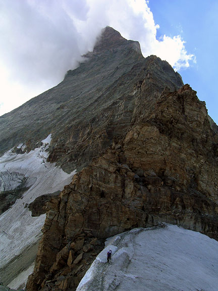 | Dennis climbing above the Shoulder. The Weisshorn is the large peak dominating the background. |