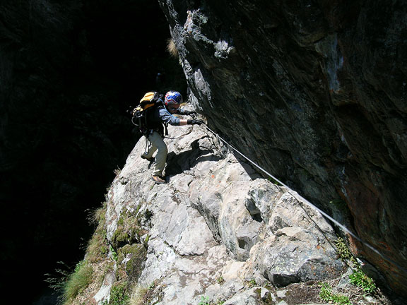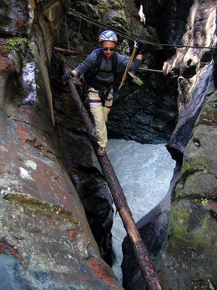 | We took a day off to heal blisters and allow the passing of a bit of unstable air, but also to have a bit of fun in the Gorner Gorge. This is a bit of a cross between canyoneering and a via ferrata, complete with several Tyrolean Traverses, a "King Swing" as well as other amusements. With the warm weather, the river through the gorge was running high! |