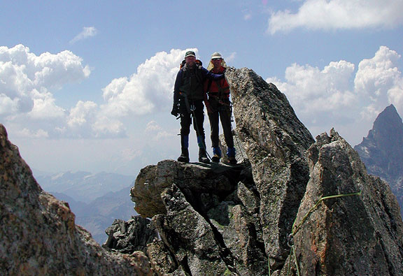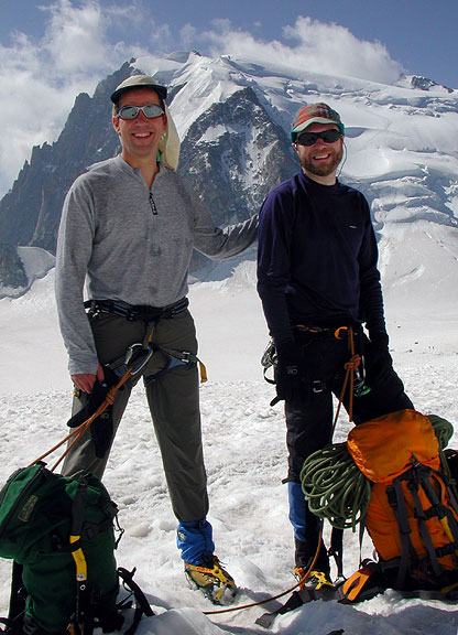 | Kathy, Hooker and the shoulder of the Virgin Mary on the summit of the Géant Mont Blanc behind. |