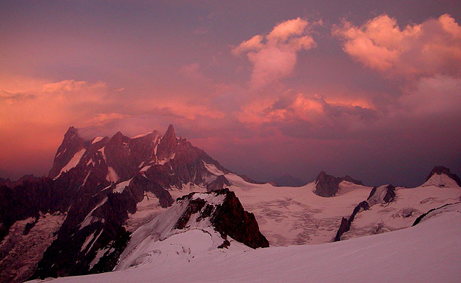 | The Grandes Jorasses and the Dent du Géant at sunset. The view from the Cosmiques hut. |