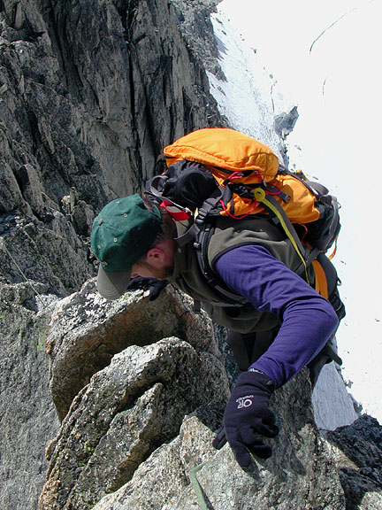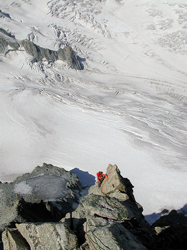 | After the Cosmiques, all three of them did the traverse of the Aiguille d'Entrèves. Here, Brett is climbing along the rocky ridge. |