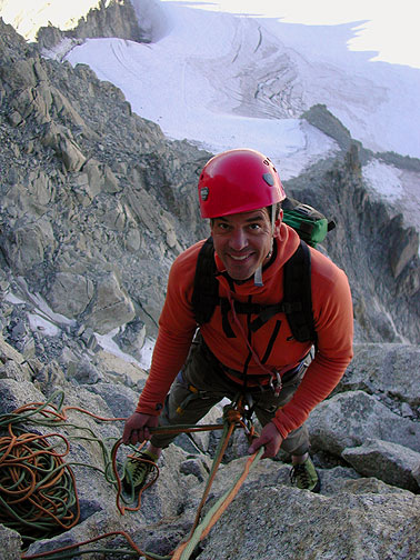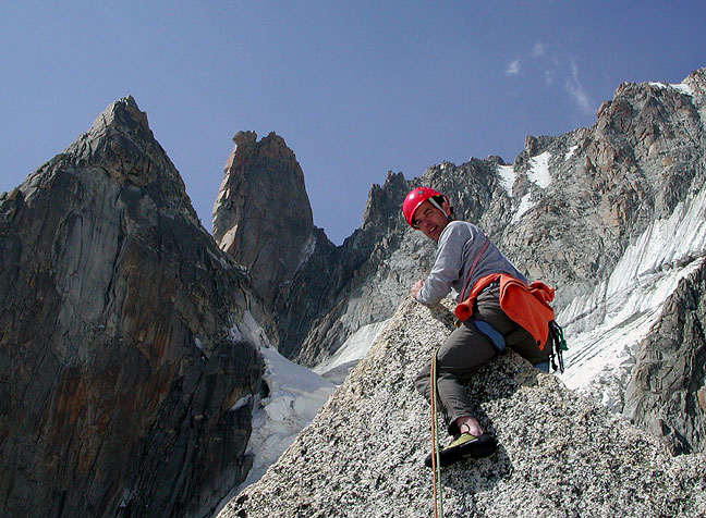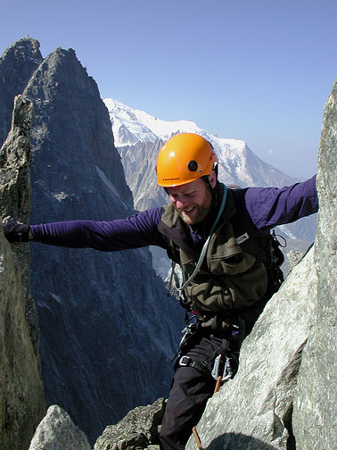| Hooker tags the highest point of the Pyramid du Tacul. The Petit Capucin and the Grand Capucin are the rock towers behind. |