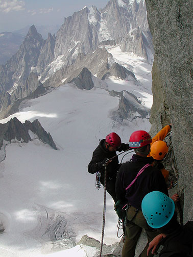 | Brett and Hooker met up with Kathy in the Chamonix area. They were able to climb the Cosmiques Arête, the traverse of the Aiguille d'Entrèves, the East Arête of the Pyramid du Tacul, the Dent du Géant and the icy north side of the Petite Verte. Unfortunately Brett got a mysterious stomach bug and we was forced to "sit" out the Pyramid and the Dent. |