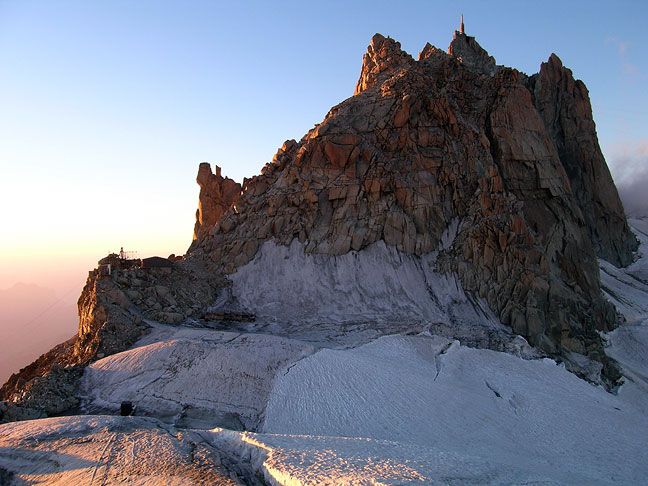 The Cosmiques Arête on the Aiguille du Midi was our first climb. The route follows the left-hand skyline, more or less. Notice how dry the glaciers are with lots of old gray ice and rockfall debris flowing out onto the snow. This view is from the Cosmiques hut. |