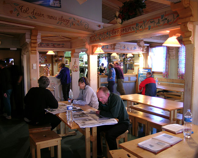 Inside the Cosmiques hut. Our original plan was to do one or two more acclimatization ascents, but the forecast called for only one more day of good weather, so we decided to go for the big one and do the Traverse of Mont Blanc. It is a lucky thing we did as the weather did indeed poop out on us the day after. |