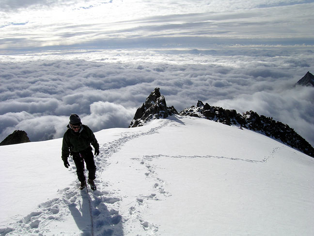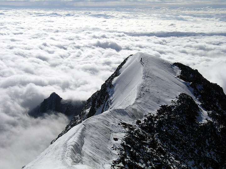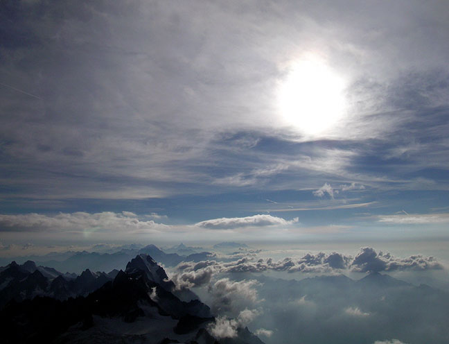 Looking east from near the summit. The Grandes Jorasses is the large peak in the foreground, the the Grand Combine just behind. The Matterhorn is the little pointy thing to the right and Monte Rosa the broad massif in the distant center of the photo. |
