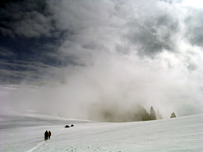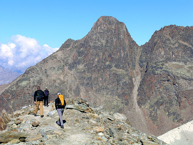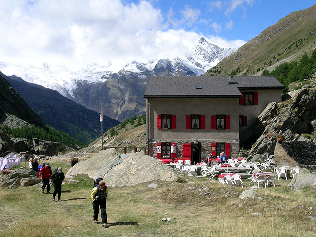 After Machaby, we continued on to Zermatt to see how conditions were there. We met Kathy and her guest, Bruce and all hiked up to the Almageller hut with designs on a traverse of the Weissmies. Here we are just leaving the Almageller Alps Hotel were we had lunch, and continuing our hike up to the hut, some 2 hours further. Cloud and wind hide the summits of the Dom and Täschhorn behind. |