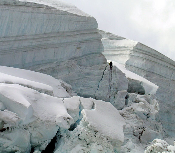 | Because of the very dry spring and the hot summer, Mont Blanc du Tacul was a bit of a mess. Local guides have put in a fixed rope over this tricky section. On the way up we walked around this part, winding through some wild crevasses, but we rappelled this wall in descent. |