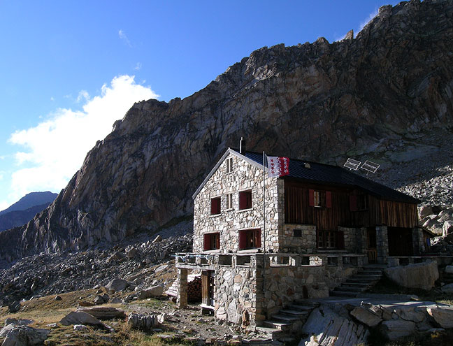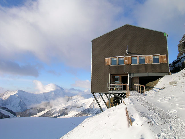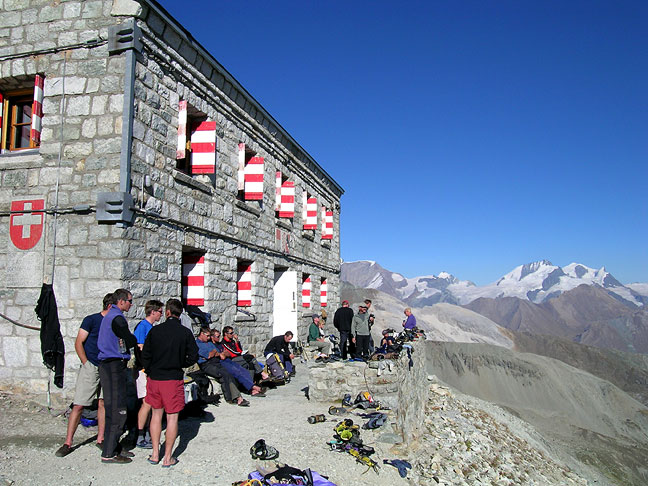 From the Jegihorn, we set our sights on the Zinal Rothorn, a superb peak just above Zermatt. This is the Rothorn hut, a good four hour's hike up above town. |