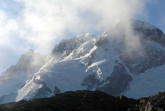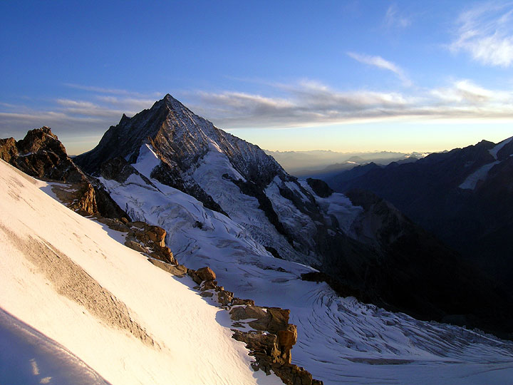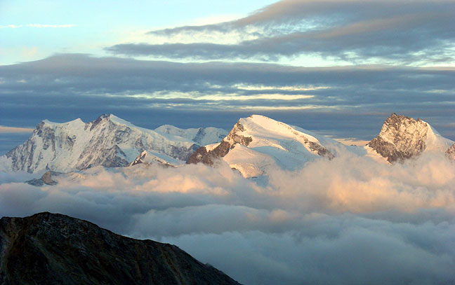 The following morning the weather stayed a bit cloudy, but this only added interest. Sunrise on Monte Rosa (left) the Strahlhorn and the Rimpfischhorn. |